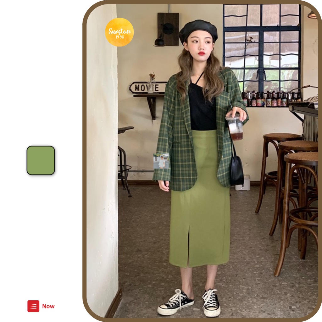 Giới thiệu Áo khoác vest blazer sọc caro xanh và chân váy suông xẻ tả màu xanh Ulzzang