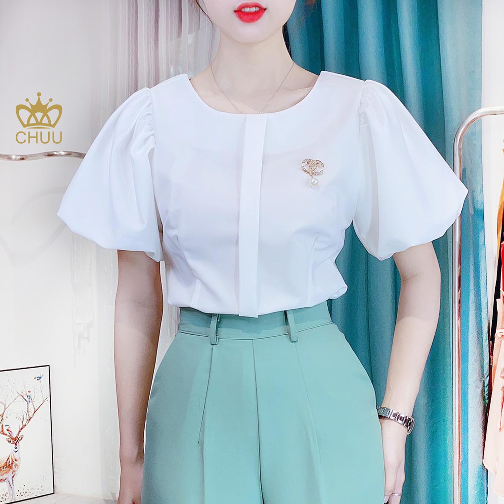 Giới thiệu Áo kiểu công sở sơ mi nữ cổ tròn tay phồng xếp li giữa CHUU A6915