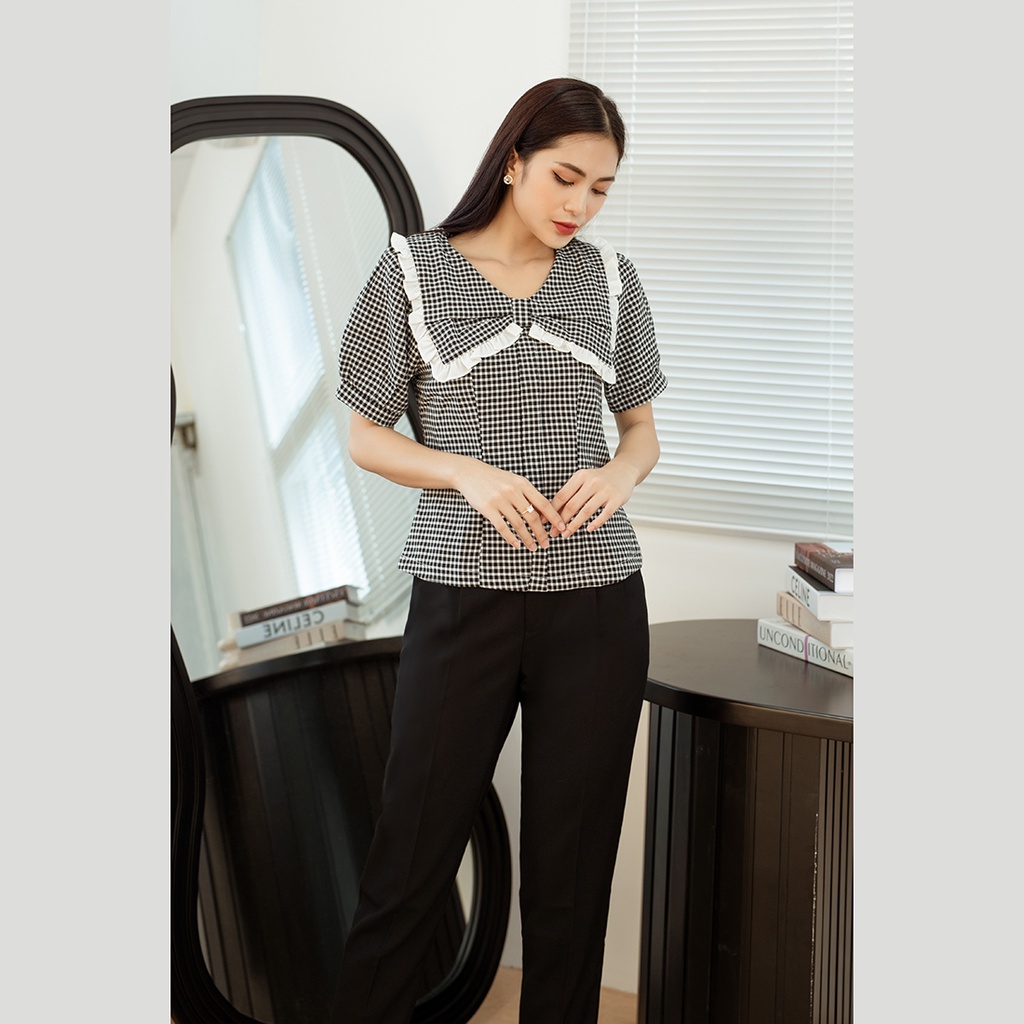 Điểm nổi bật : áo kiểu nữ công sở caro cổ nơ cách điệu thiết kế thời trang Eden dây kéo sau lưng nút gỗ trang trí - ASM186