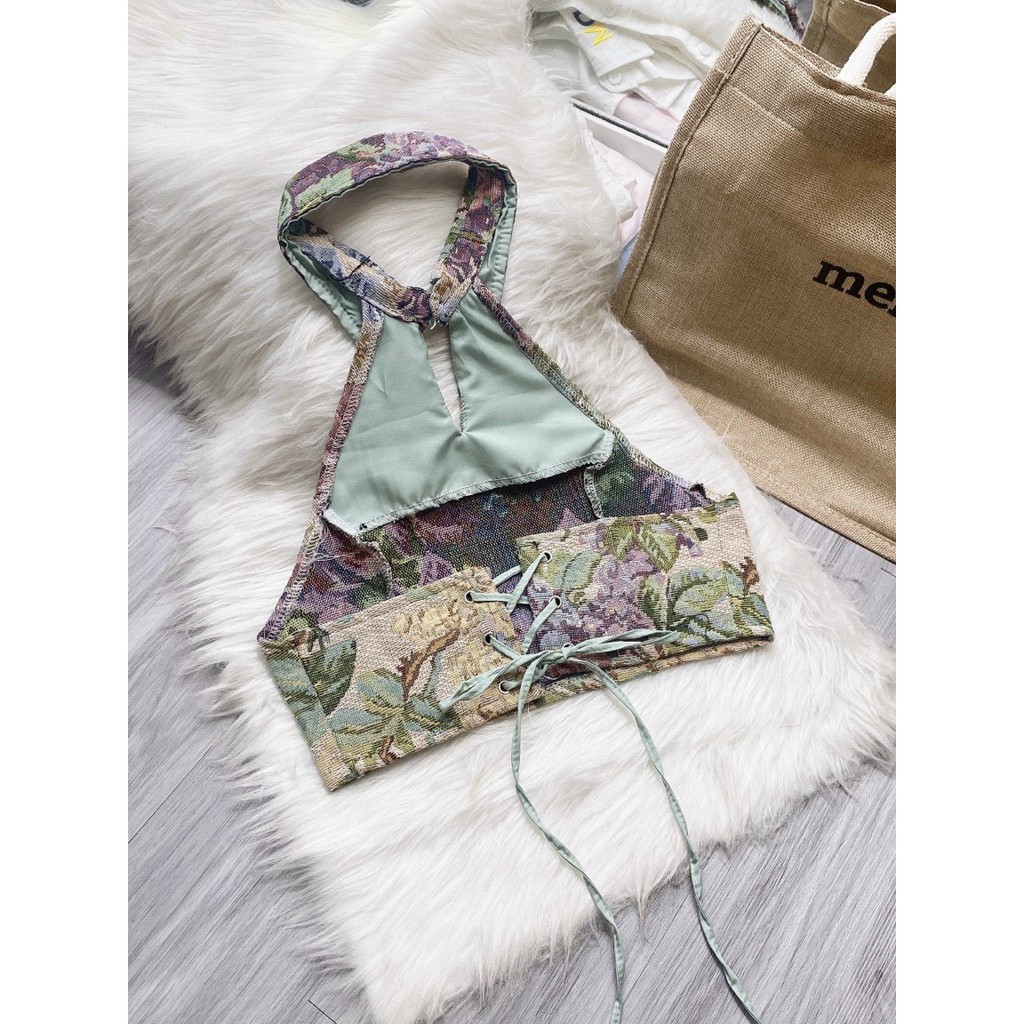 Thời Trang Nữ > Áo > Áo hai dây và ba lỗ || Áo kiểu nữ croptop cổ yếm hở lưng đan dây hoa thổ cẩm xinh ut