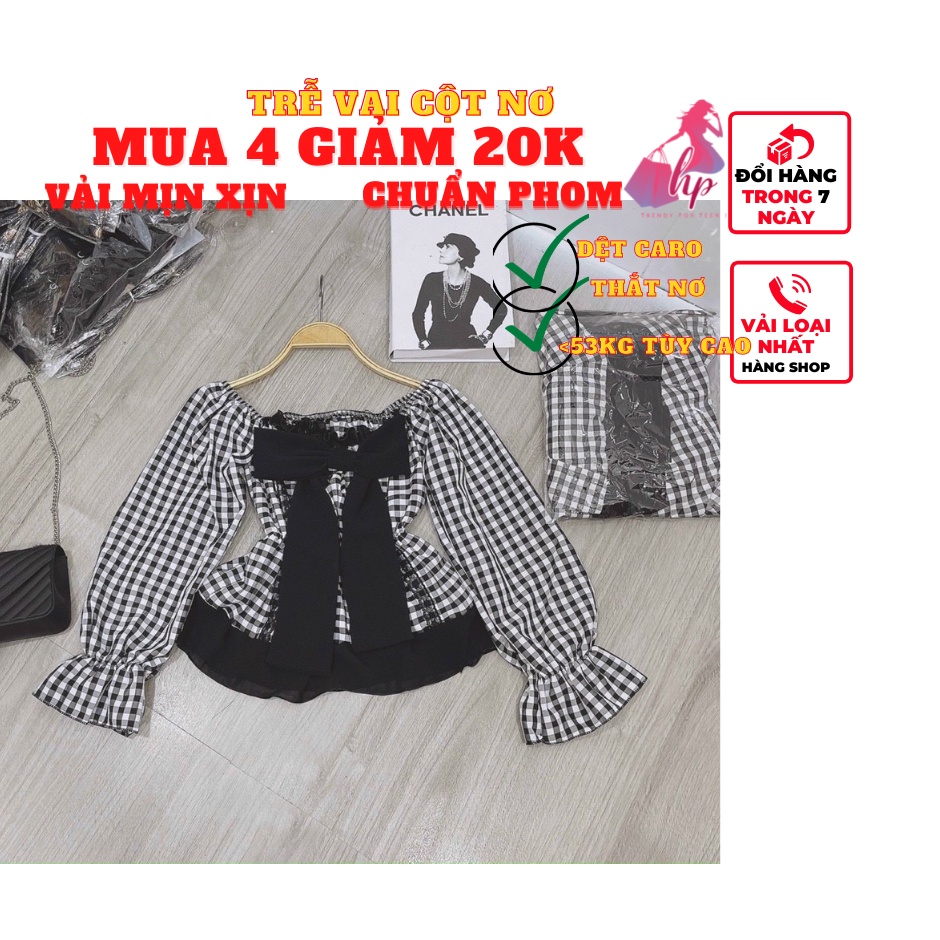 áo kiểu trễ vai nữ thắt nơ tay dài sọc caro màu trắng đen kiểu sang chảnh phong cách hàn quốc ✔️✔️✔️ CAM KẾT CHUẨN XỊN CỦA SHOP