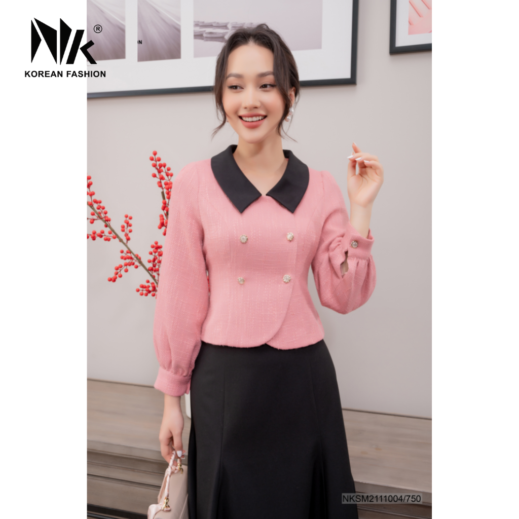 + Áo thiết kế cổ bẻ phối màu, bo eo tôn dáng, tay bo cùng cúc tinh tế. Áo ký giả có màu sắc nhã nhặn rất phù hợp với chị em trong môi trường công sở, văn phòng