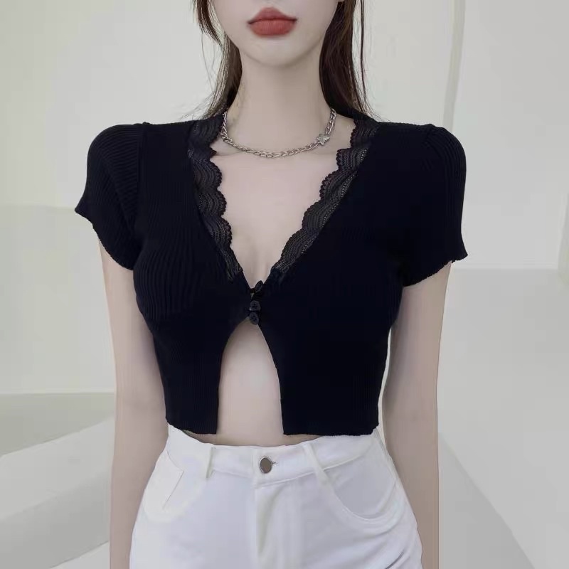 Thời Trang Nữ > Áo len || áo len dệt kim cổ pha ren mix khuy cài sexy (N292#)