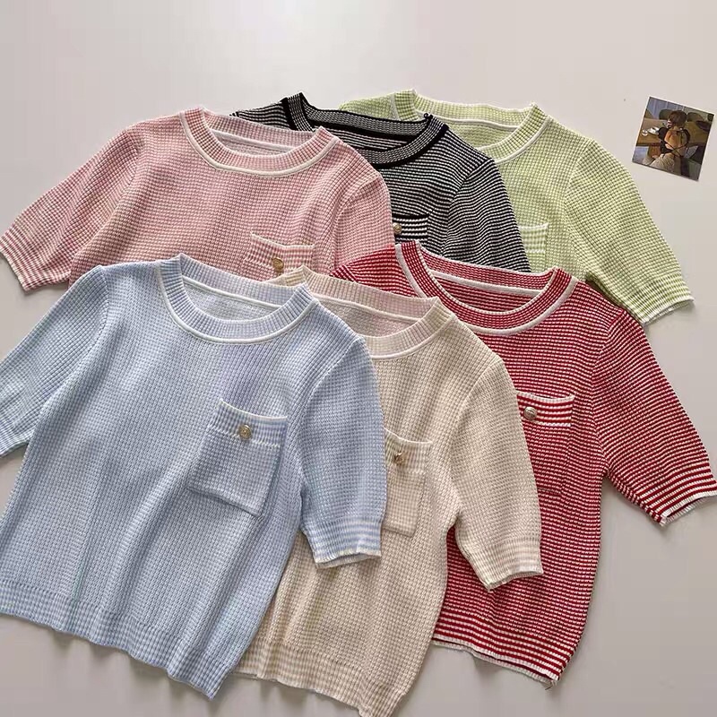 Thời Trang Nữ > Áo len || áo len dệt kim túi ngực - len kẻ nhỏ