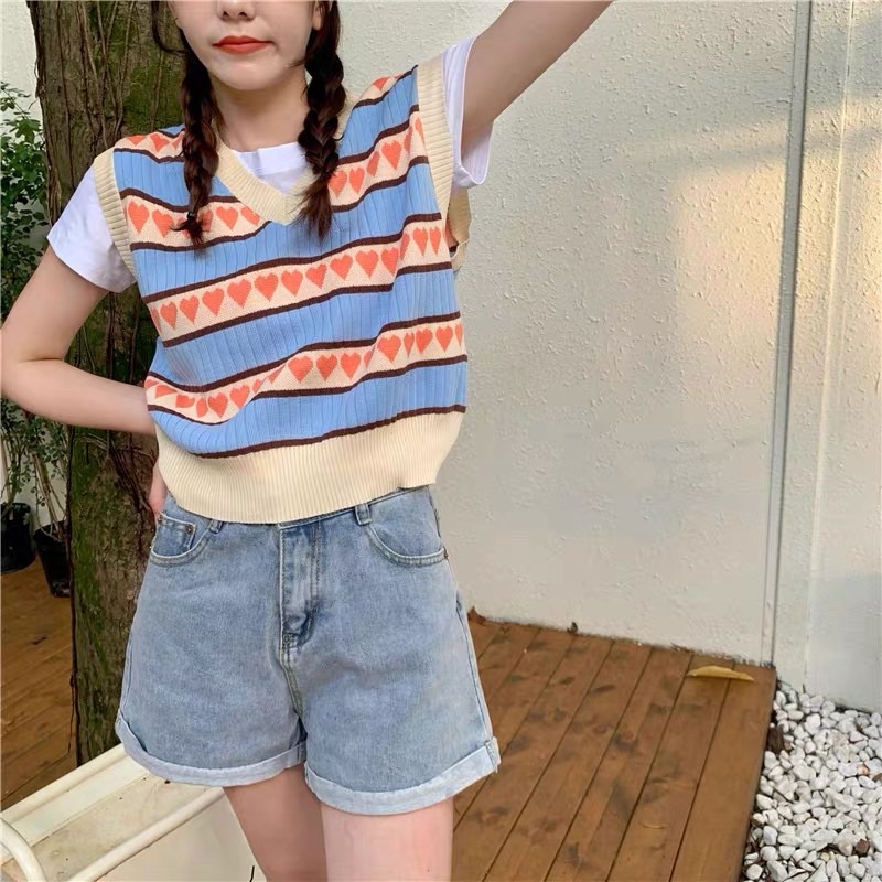 Giới thiệu Áo len gile nữ hoạ tiết hình trái tim trẻ trung cổ V phong cách Hàn Quốc cho nữ