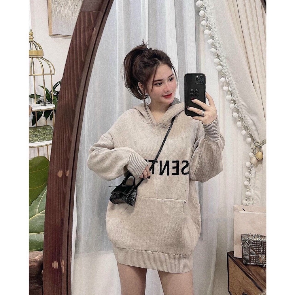 Giới thiệu Áo len nữ dài tay hoodie Quảng Châu màu be thiết kế có mũ dáng rộng thụng trùm mông phong cách cá tính trẻ trung