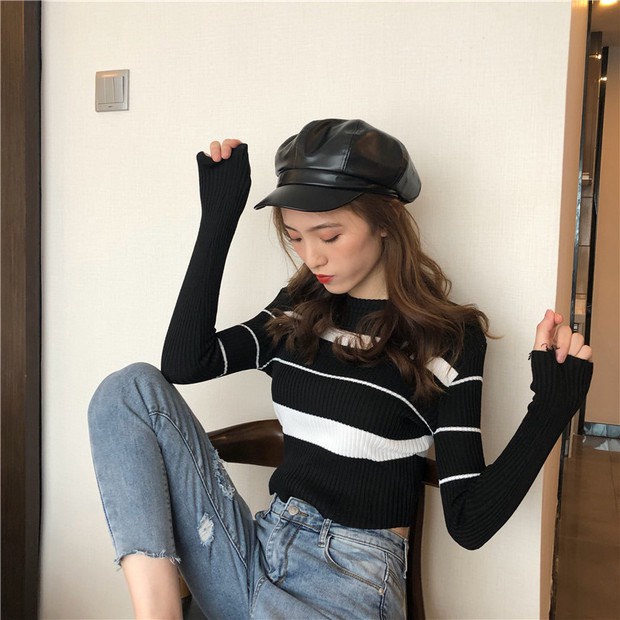 Giới thiệu Áo len tăm nữ dài tay cổ tròn, hoạ tiết kẻ ngang tôn dáng hàng VNXK, freesize