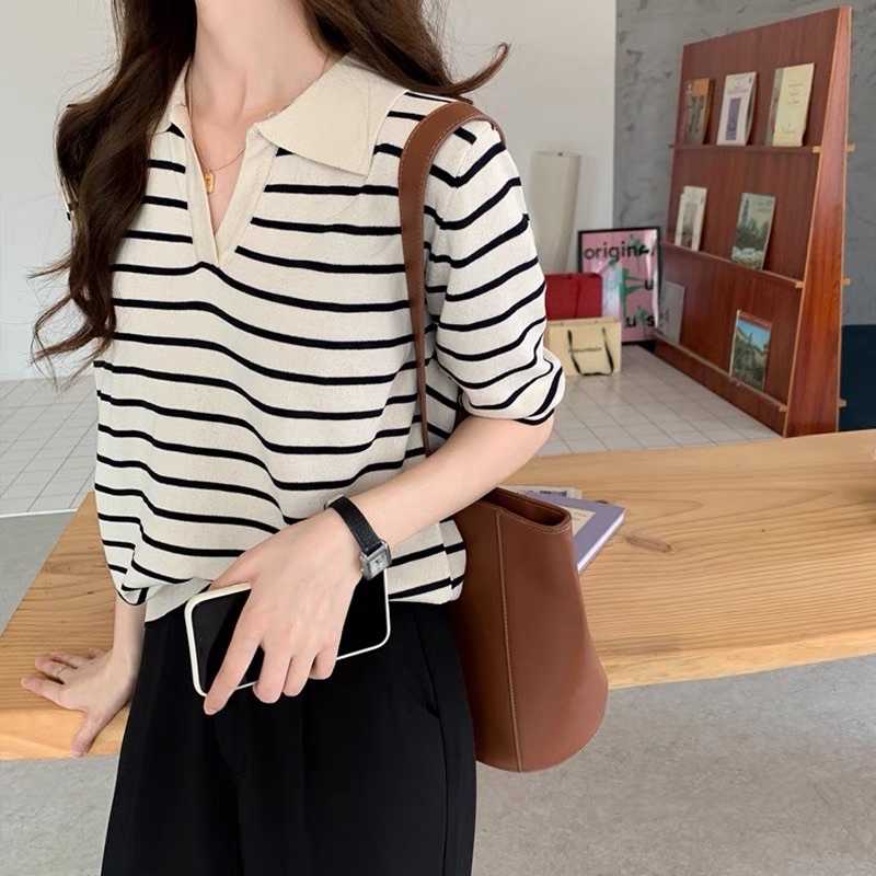 Giới thiệu [ Áo polo cổ bẻ] Áo len mỏng cổ bẻ dáng xuông họa tiết kẻ ngang tay lỡ PL01