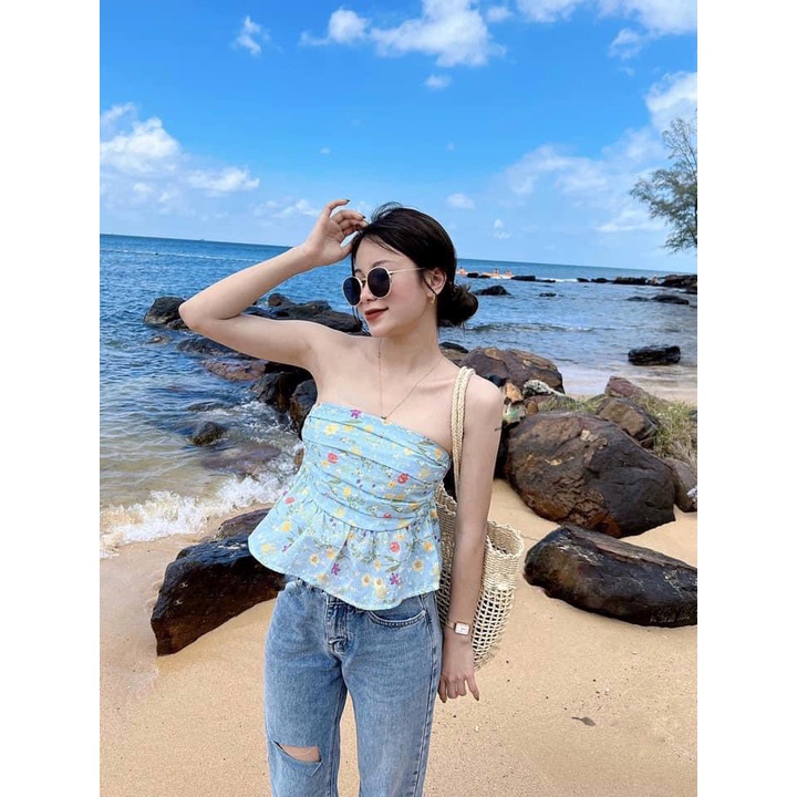 Thời Trang Nữ > Áo > Khác || Áo quây hoa nhí xoè màu xanh biển lưng chun A2184