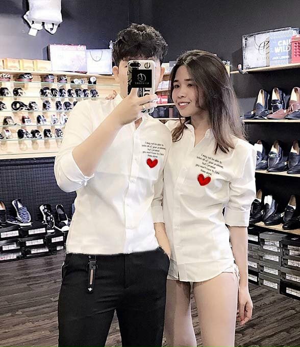 Thiết kế Áo sơ mi cặp in hình trái tim cao cấp phong cách đường may tỉ mỉ.