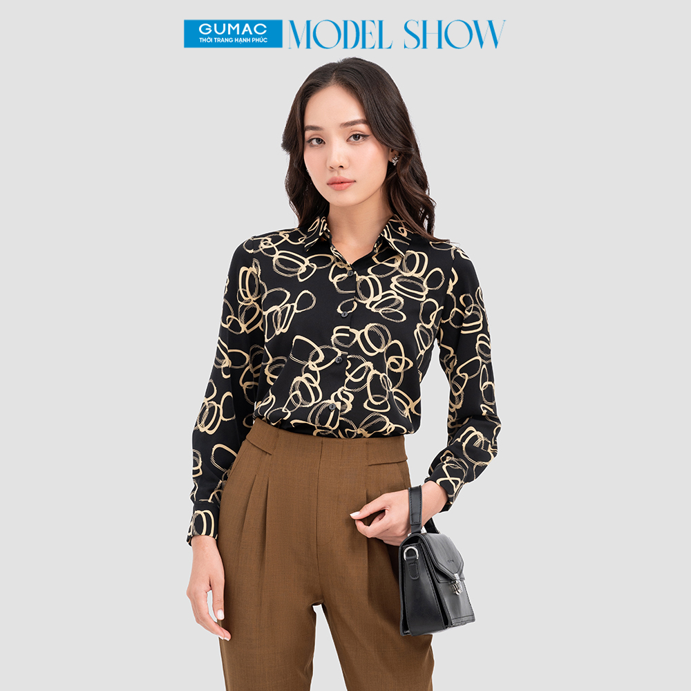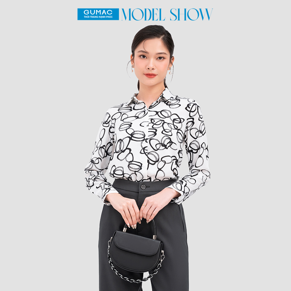 Áo Sơ Mi Cơ bản họa tiết dài tay, phom suôn thoải mái, đầu lá bâu nhọn.