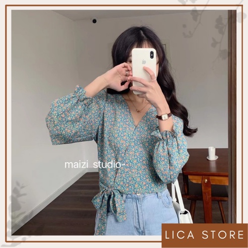 Giới thiệu Áo Sơ Mi Kiểu Nữ Tay Dài hoa nhí cổ V nơ eo dễ thương ulzzang phong cách Hàn Quốc LICA - A29