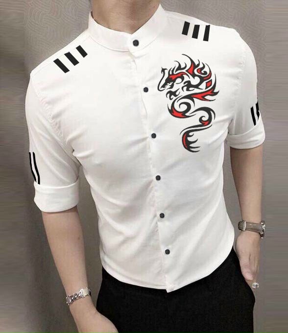 Thiết kế Áo sơ mi nam dài tay sọc vai, tay họa tiết rồng đỏ cao cấp phong cách đường may tỉ mỉ.