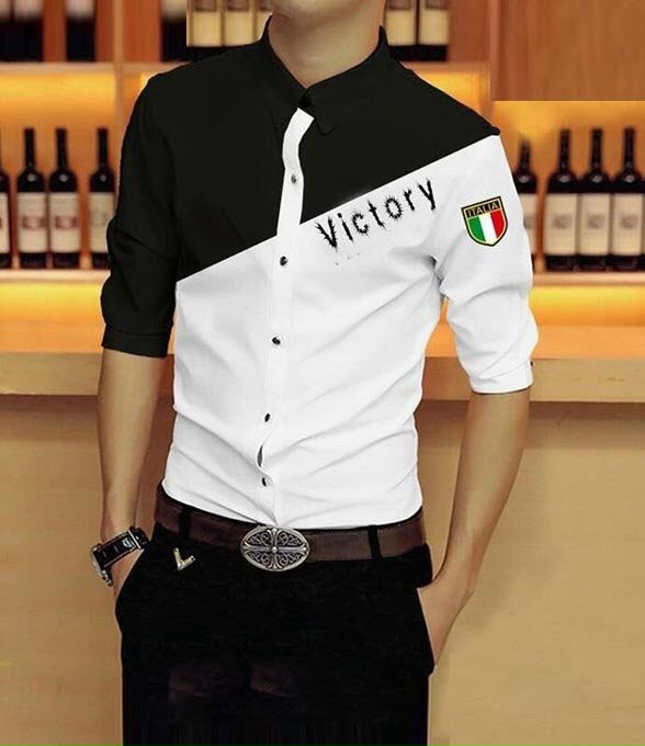 Thiết kế Áo sơ mi nam đen trắng họa tiết chữ Victory cao cấp phong cách đường may tỉ mỉ.
