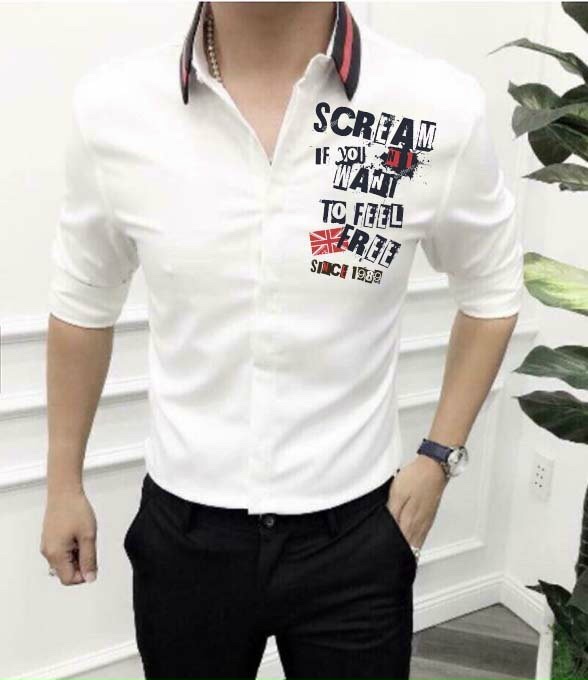 Thiết kế Áo sơ mi nam tay dài viền cổ đen đỏ họa tiết chữ cao cấp phong cách đường may tỉ mỉ.