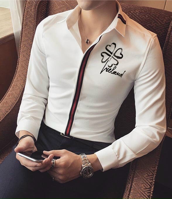 Thiết kế Áo sơ mi nam viền giữa họa tiết cỏ bốn lá và chữ cao cấp phong cách đường may tỉ mỉ.