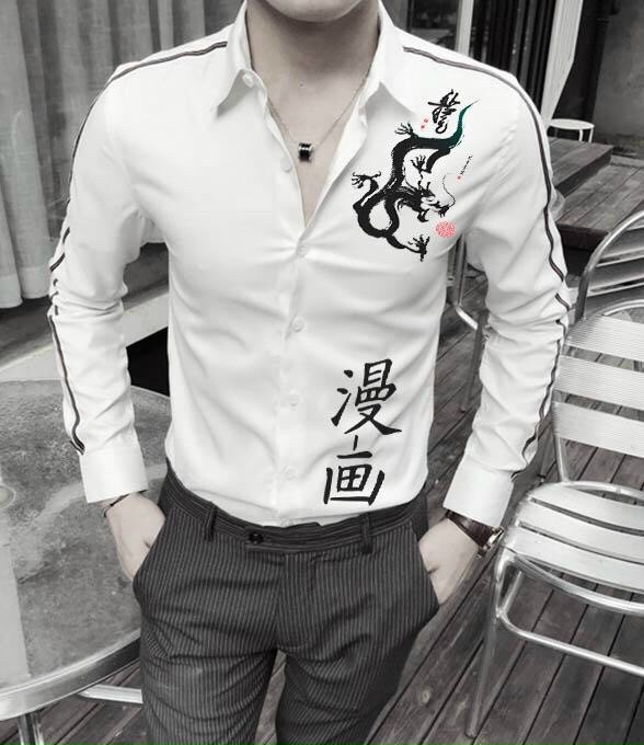 Thiết kế Áo sơ mi nam viền tay, vai họa tiết chữ tàu và rồng cao cấp phong cách đường may tỉ mỉ.