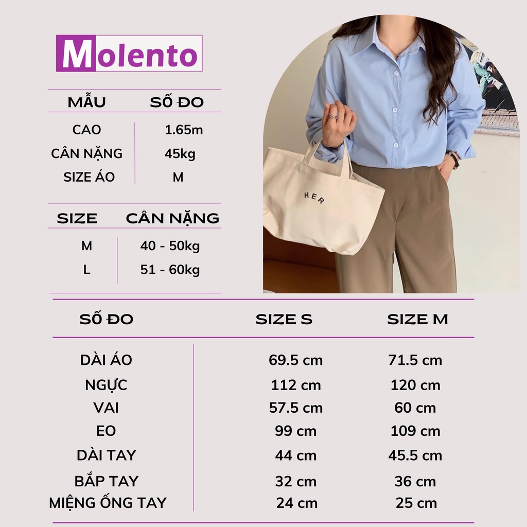 ✅ THÔNG TIN CHI TIẾT SẢN PHẨM: – Sản phẩm: Áo sơ mi nữ công sở tay dài Molento áo sơ mi form rộng chất đũi tơ thoáng mát mix đồ cực xinh – Màu sắc: Nhiều màu – Họa tiết: Trơn – Form: Vừa – -Size: Size M: từ 42kg đến 50kg Size L: từ 51kg đến 62kg