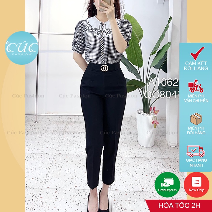 Giới thiệu Áo sơ mi nữ Cúc Fashion somi tay ngắn cao cấp vải lụa from đẹp thời trang công sở đen đi học kẻ cara cổ trắng A1062