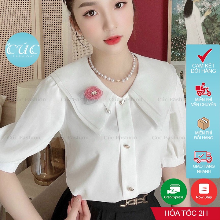 Thời Trang Nữ > Áo > Áo sơ mi || Áo sơ mi nữ CÚC FASHION somi tay ngắn cao cấp vải lụa đẹp thời trang công sở dễ thương trắng đi học cổ nhọn 2 lớp A1073