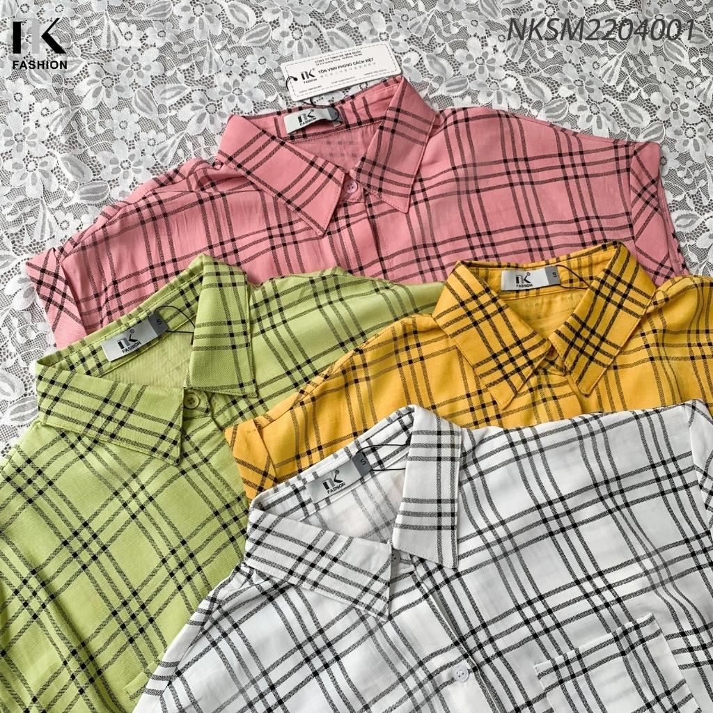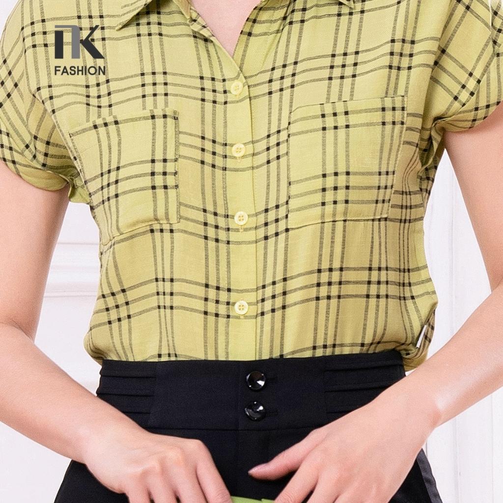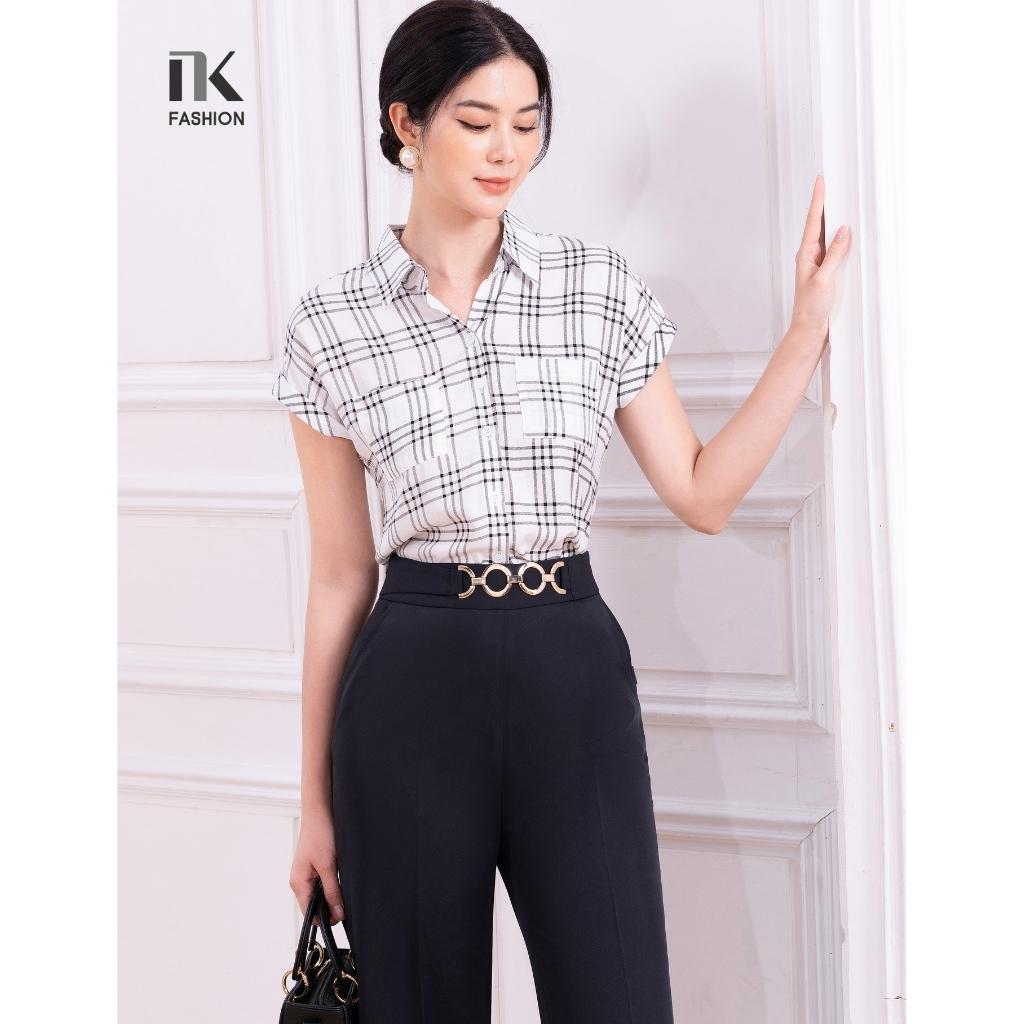 + Sơmi nữ thiết kế cổ đức tay ngắn, vai chờm họa tiết kẻ hiện đại, màu sắc nhã nhặn rất phù hợp với chị em trong môi trường công sở, văn phòng