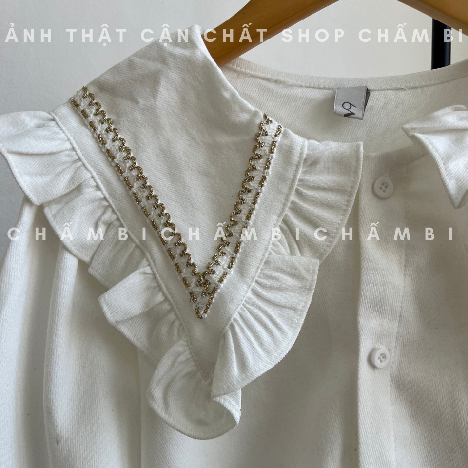 ✪ Màu sắc Áo sơ mi dạ nhung cổ thủy thủ bèo nhún thêu viền vàng: trắng, be