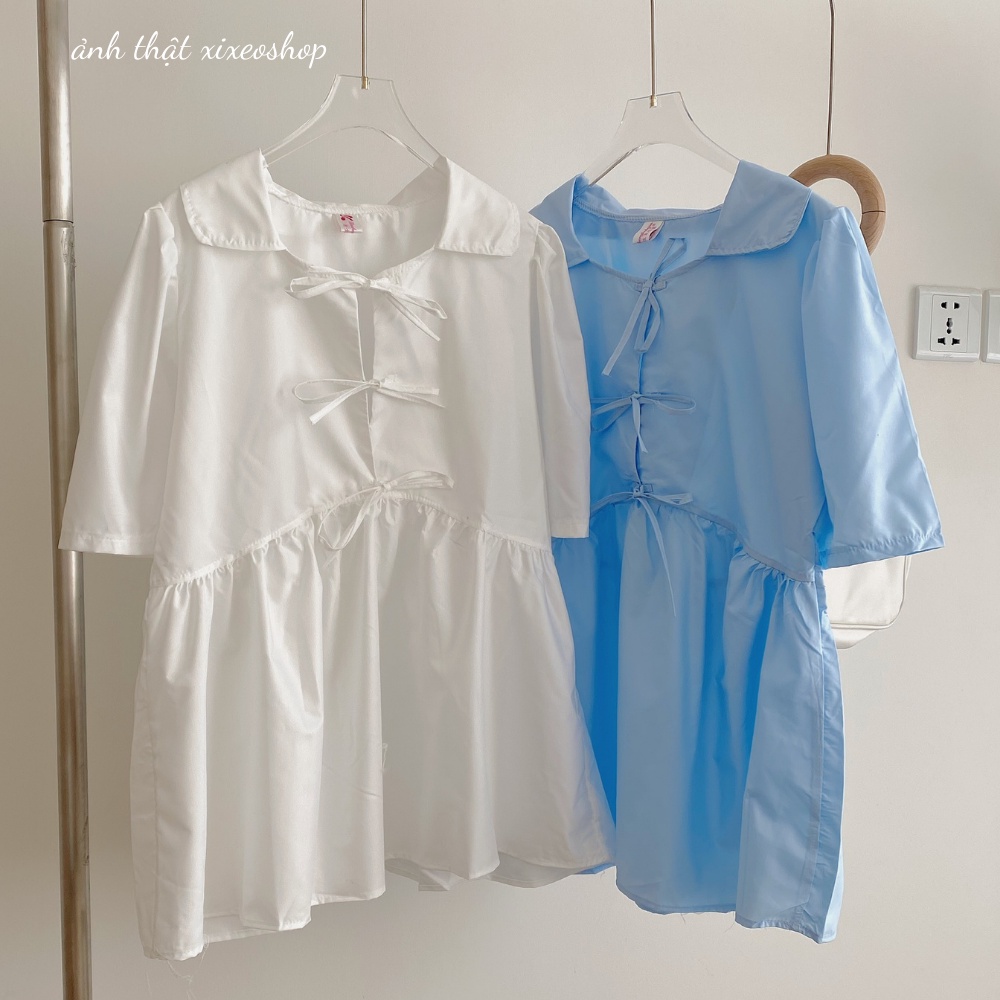 Giới thiệu Áo sơ mi nữ trắng xanh dáng babydoll thắt nơ xinh xixeoshop - V43
