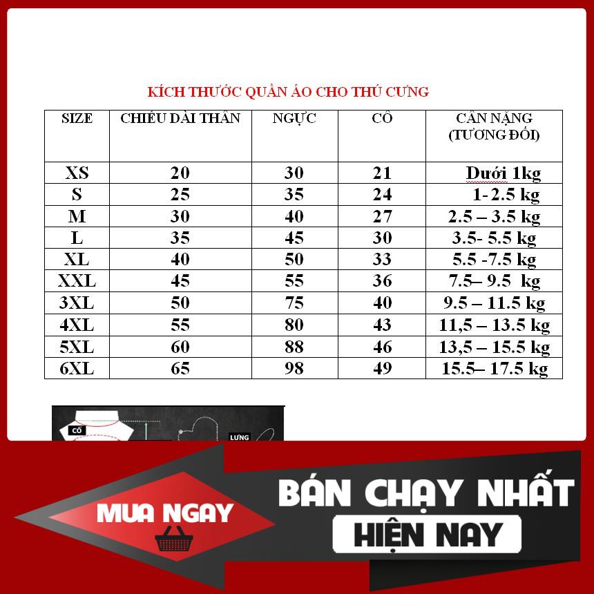 Hướng dẫn chọn size quần áo cho chó mèo XS Ngực 28cm Chiều dài 18cm (1-2 kg) S: Ngực 33cm Chiều dài 23cm ( 2-3 kg) M: Ngực 38cm Chiều dài 28cm (4 kg) L: Ngực 43cm Chiều dài lưng 33cm 6 kg) XL: Ngực 48cm Chiều dài lưng 37cm ( 9 kg) XXL: Ngực 53cm Chiều dài lưng 42cm (12kg) Lưu ý: Sẽ có lỗi 1-3cm do phương pháp đo lường khác nhau cho mỗi người