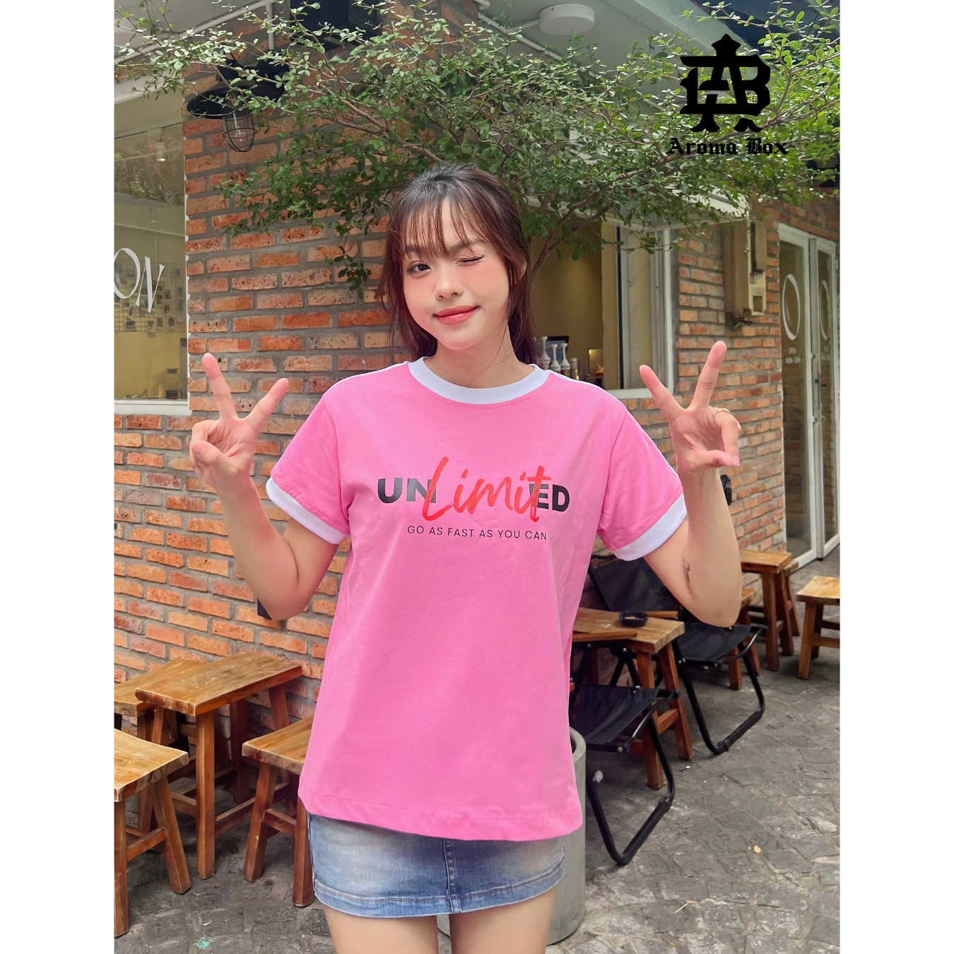 Áo thun BABY TEE phối viền tay 2 sọc AROMA, thiết kế tối giản đem lại cho người dùng sự tinh tế, cùng dòng chữ UN LIMITED là điểm nhấn trước ngực