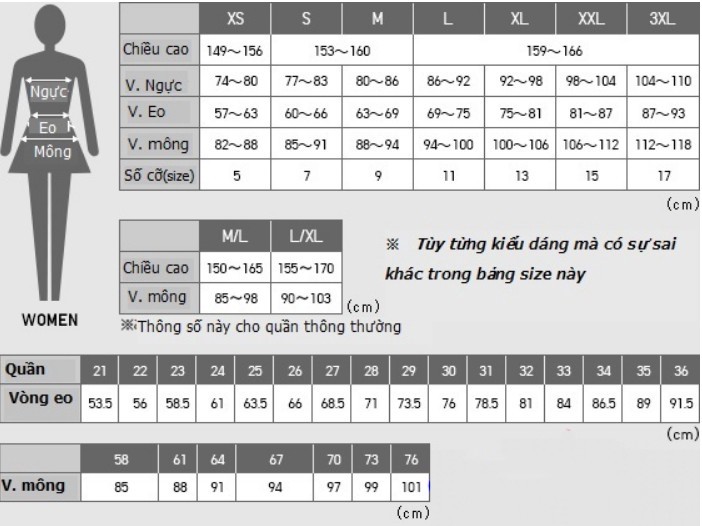 Bảng tính kích cỡ áo cho nữ (Size chart)