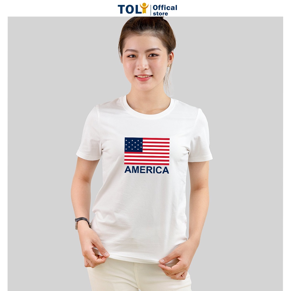 Giới thiệu Áo thun nữ TOLI cổ tròn màu vàng in AMERICA, 100% cotton 4 chiều mềm mịn, co dãn, form suông cơ bản