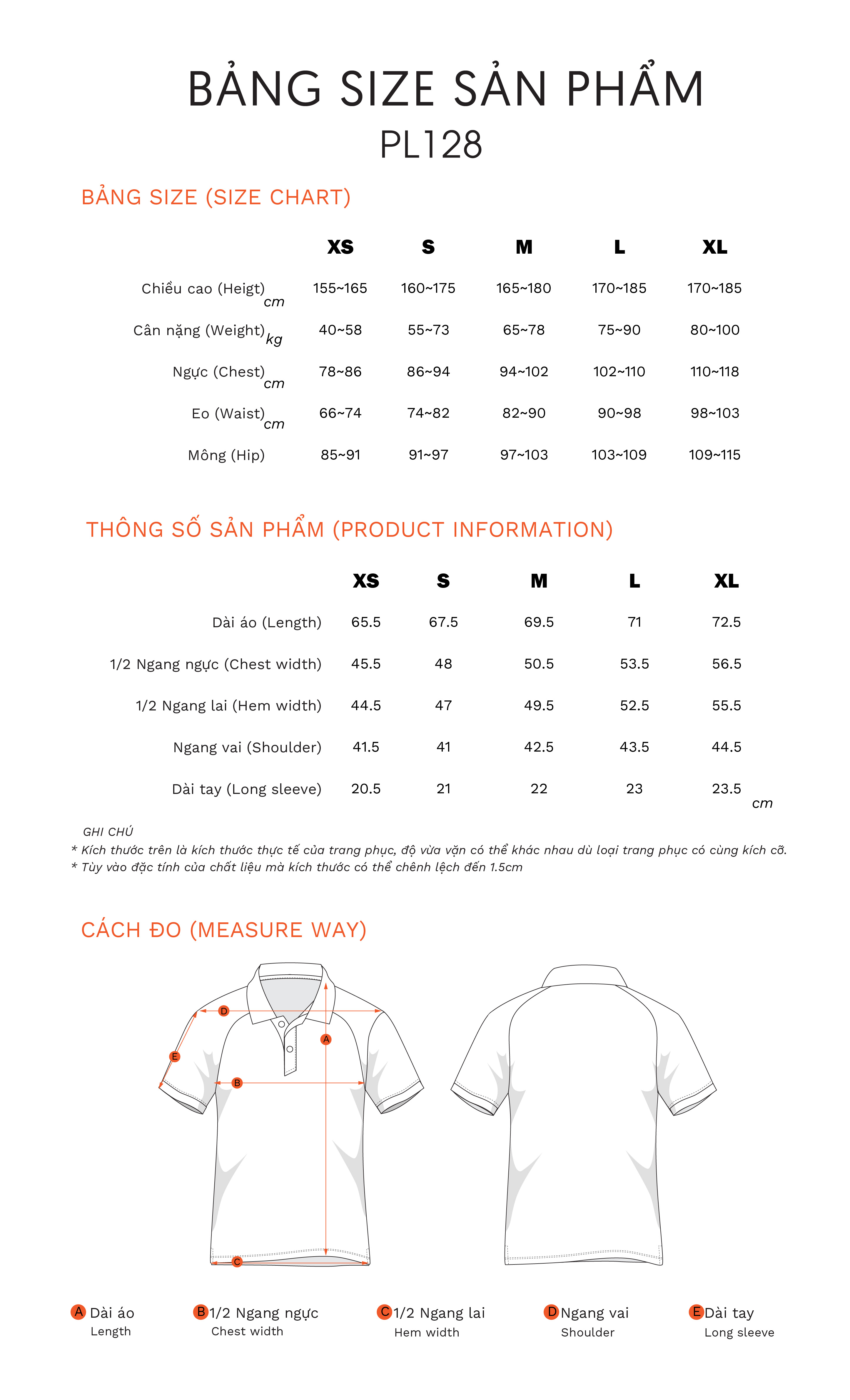 Size XS: Từ 1m55 - 1m65. 40-58kg.