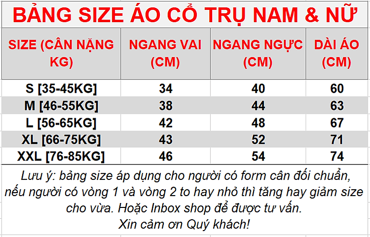 | Kích thước | "SIZE (CÂN NẶNG KG)" : "NGANG VAI(CM)" - "NGANG NGỰC(CM)" - "DÀI ÁO (CM)"S [35-45KG]: 34 - 40 - 60M [46-55KG]: 38 - 44 - 63L [56-65KG]: 42 - 48 - 67XL [66-75KG]: 43 - 52 - 71XXL [76-85KG]: 46 - 54 - 74BẢNG SIZE ÁO NAM FORM CHUẨNLưu ý: Nếu vòng 1,2,3 to hoặc nhỏ thì nên tăng, giảm size.Hoặc inbox để shop tư vấn size cho vừa với mình ạ.Shop Xin Chân Thành Cảm Ơn! |