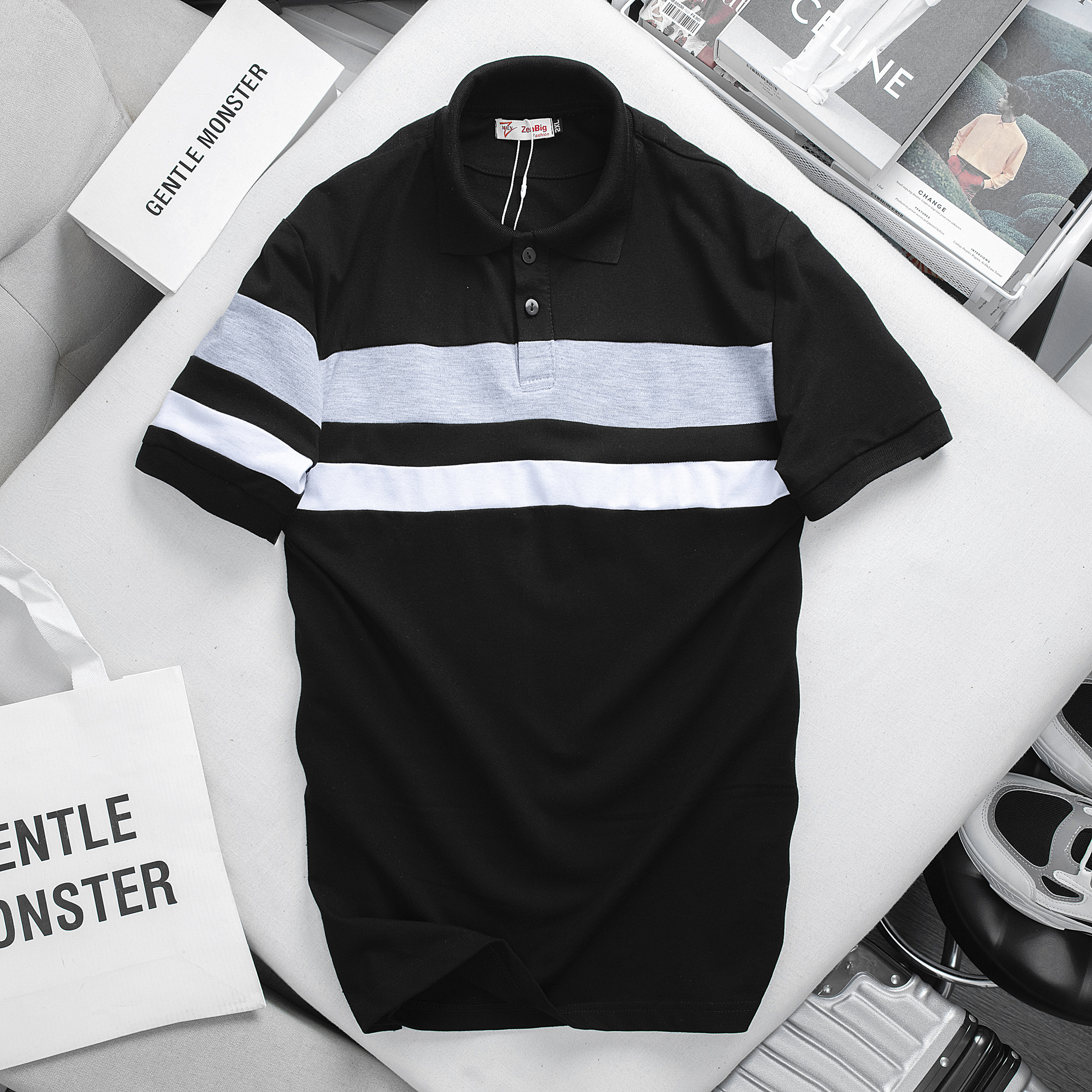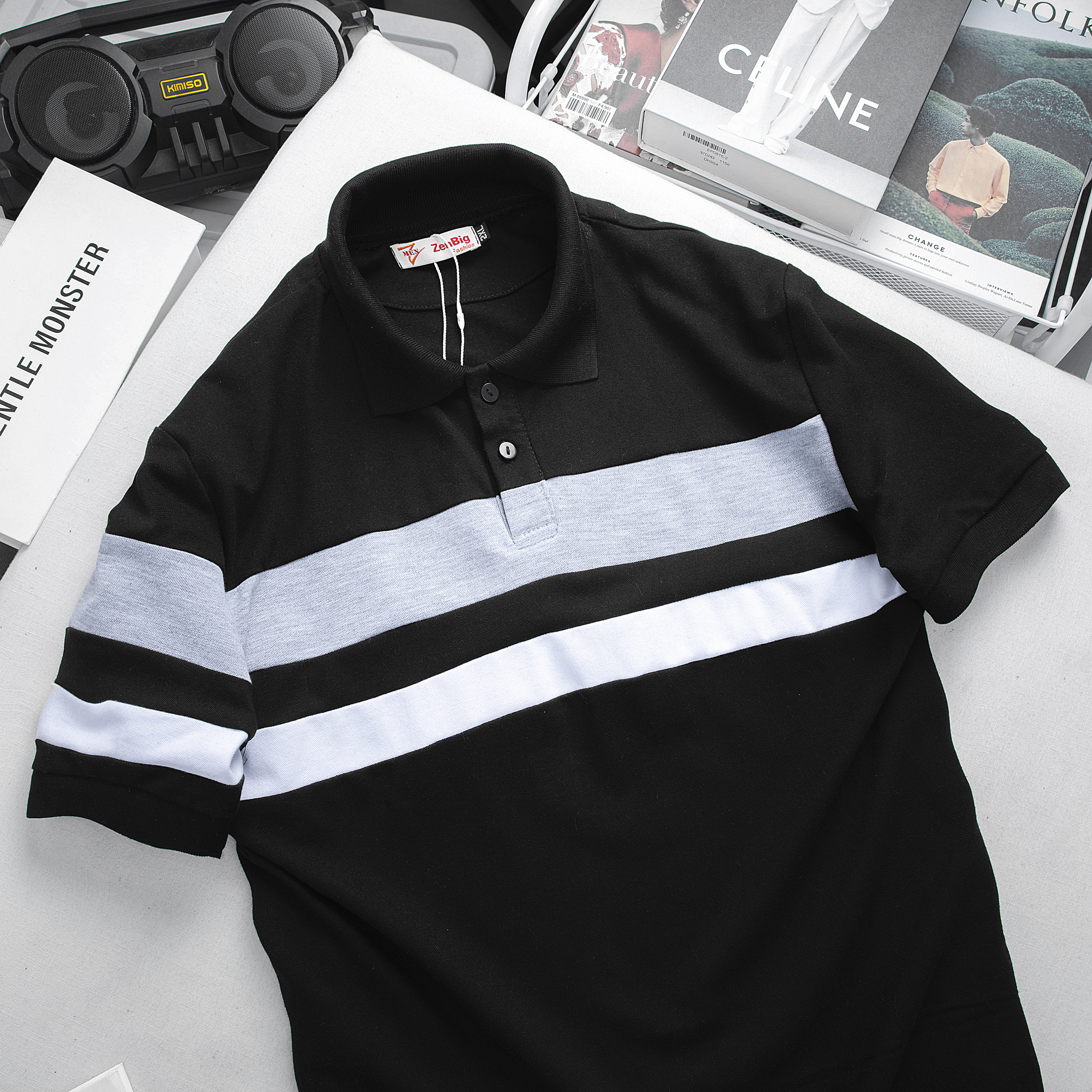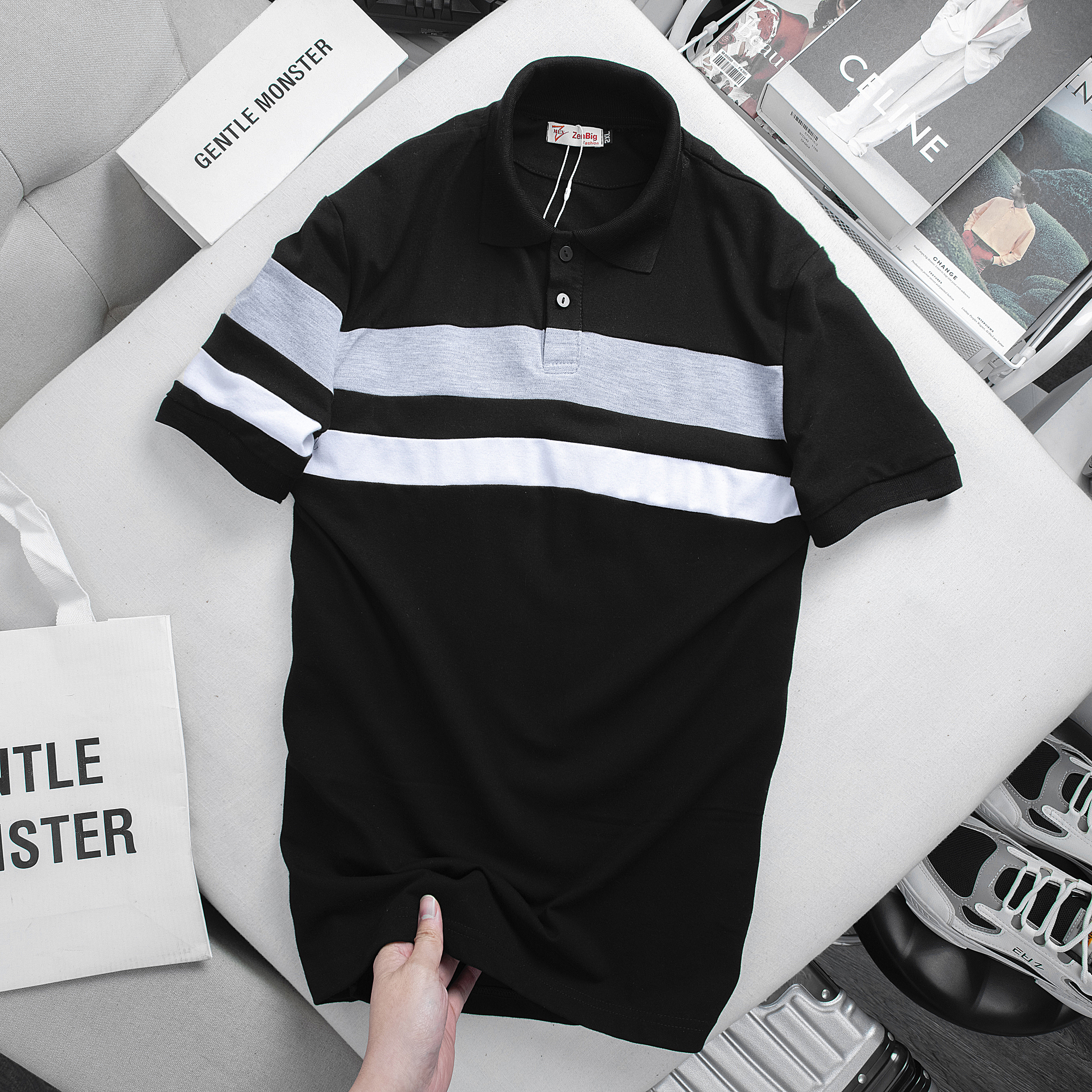 - Kiểu áo: áo polo có cổ trụ thiết kế với form rộng dáng regular suông lại thêm điểm nhấn độc đáo, mới lạ là 2 sọc kẻ ngang ngực nối liền qua tay phải, trong khi bên tay trái thì trơn.