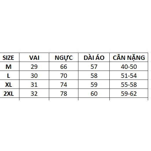 Kích thước: M(40-50)KG L(51-54)KG XL(55-58)KG 2XL(59-62)KG