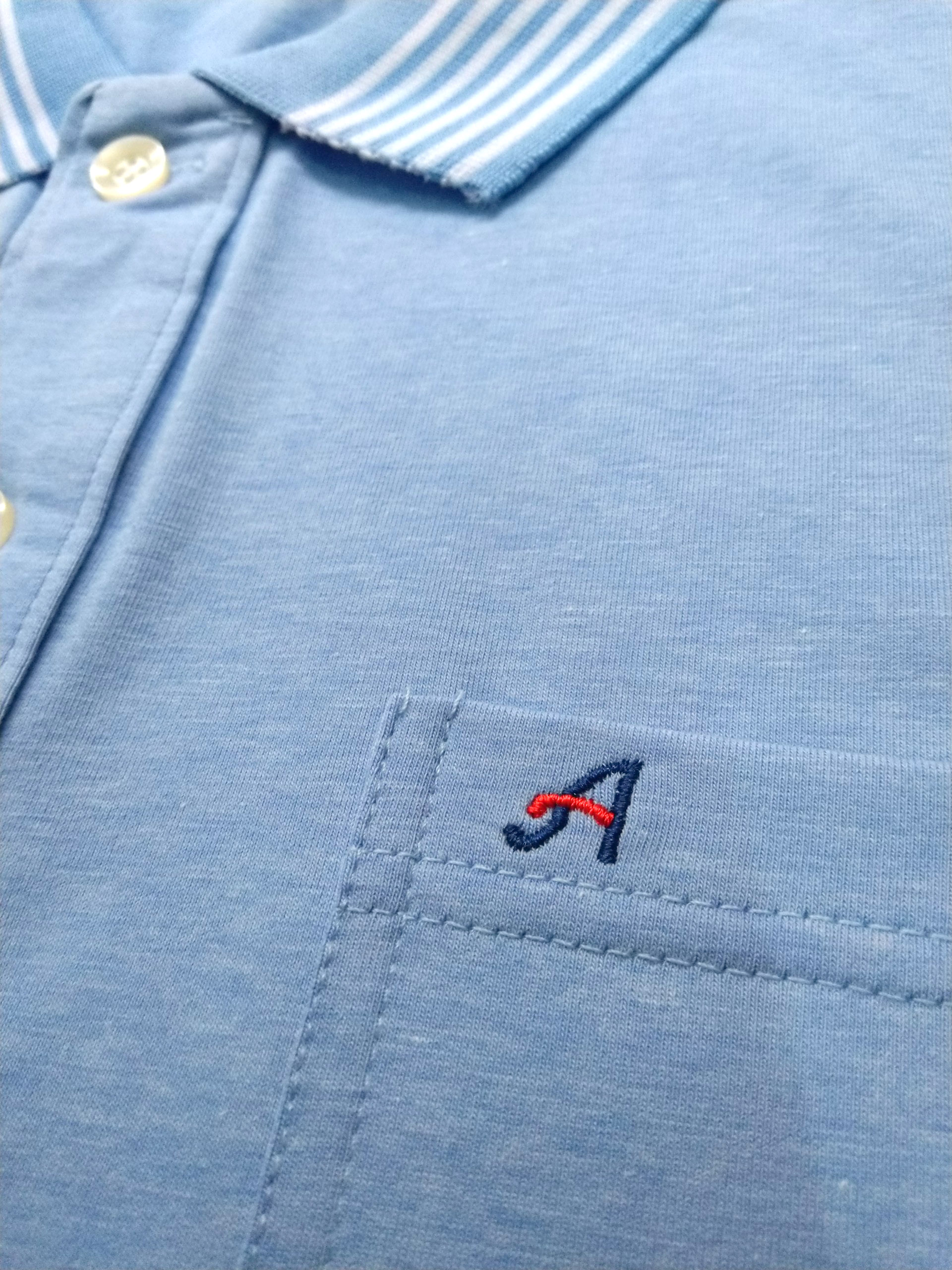 Áo phối sọc ngang ở cổ, trước ngực thêu chữ nổi.