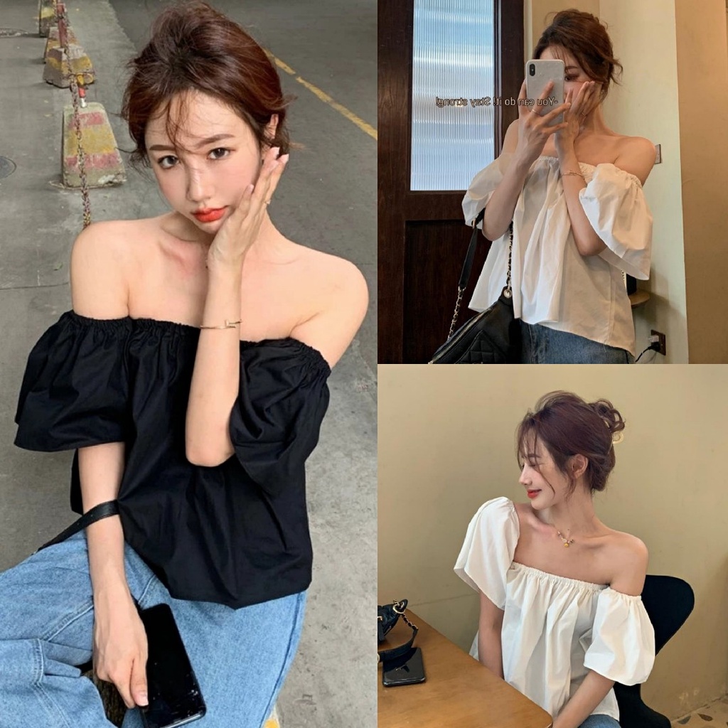 Giới thiệu Áo trễ vai tay bồng, áo nữ trơn ngắn tay vải thô 3 màu phối chun basic DASKI