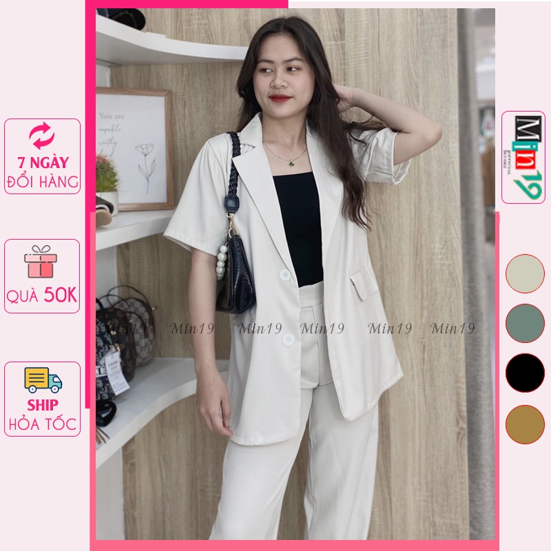 Thời Trang Nữ > Áo khoác > Áo blazer || Áo Vest Nữ Blazer MIN19 Áo Blazer Công Sở Hàn Quốc 1 Lớp Tay Ngắn Form Rộng Túi Nắp Cá Tính Màu Trắng Đen Xanh Nâu