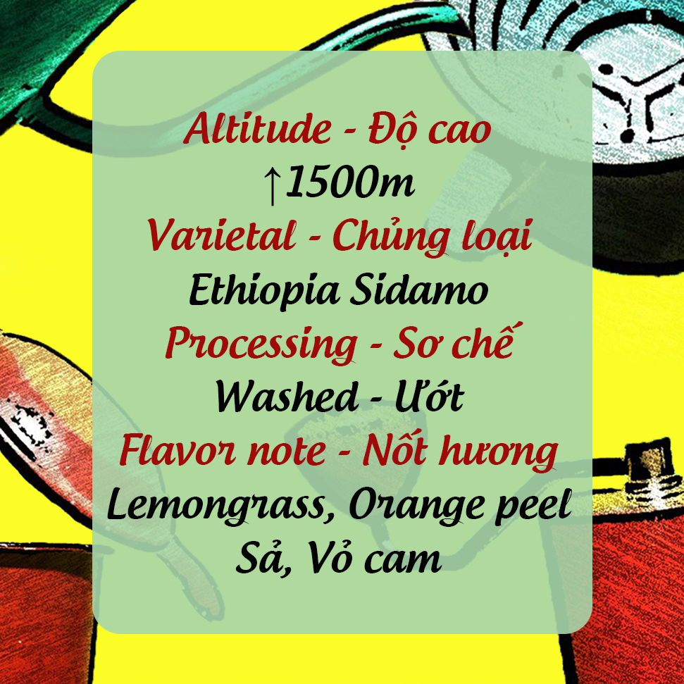 Cà phê từ vùng Sidamo, Ethiopia. Rang độ sáng vừa (medium light roast), thích hợp cho pha chemex, v60, kalita. Để nguyên hạt, đóng gói túi 500g.