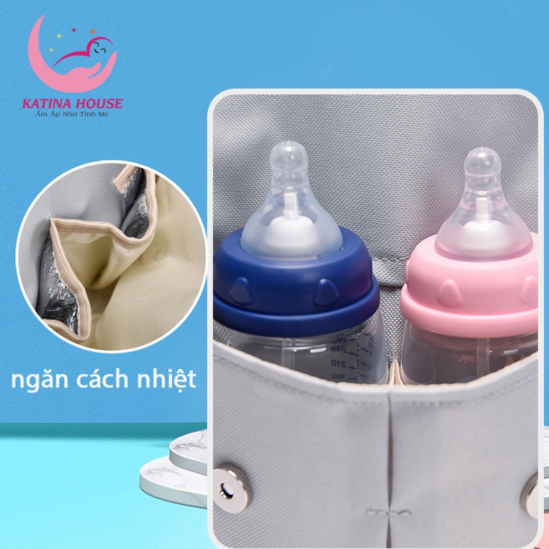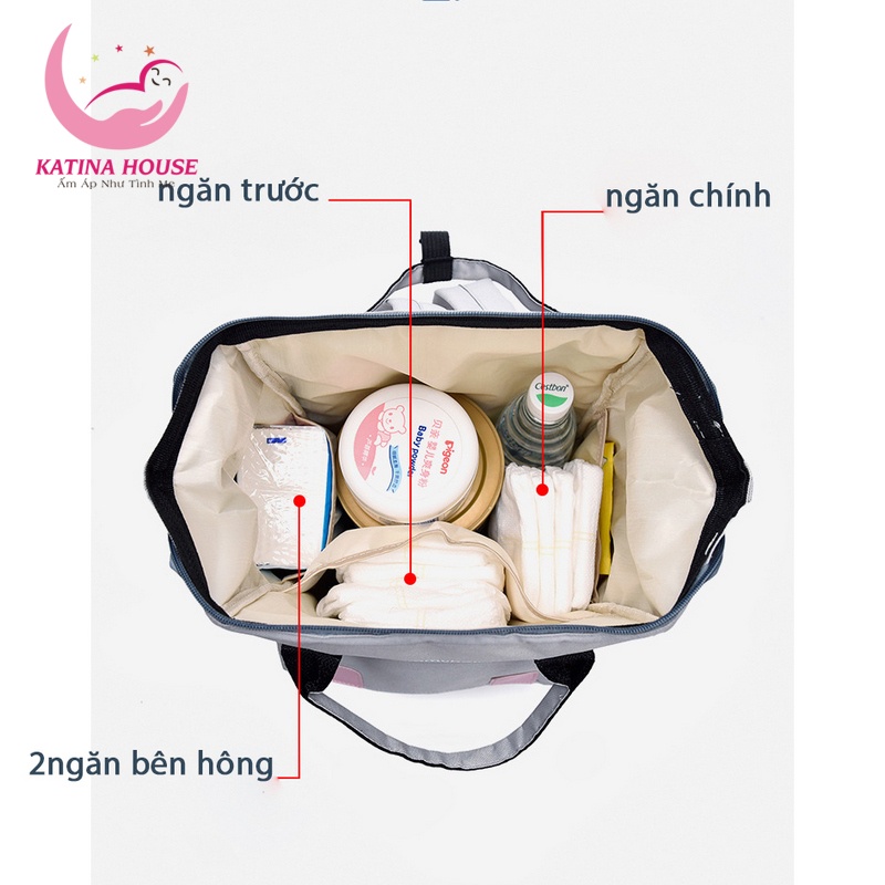 Balo bỉm sữa gồm nhiều ngăn phụ đa năng như: đựng bình sữa giữ nhiệt, khăn giấy ướt,