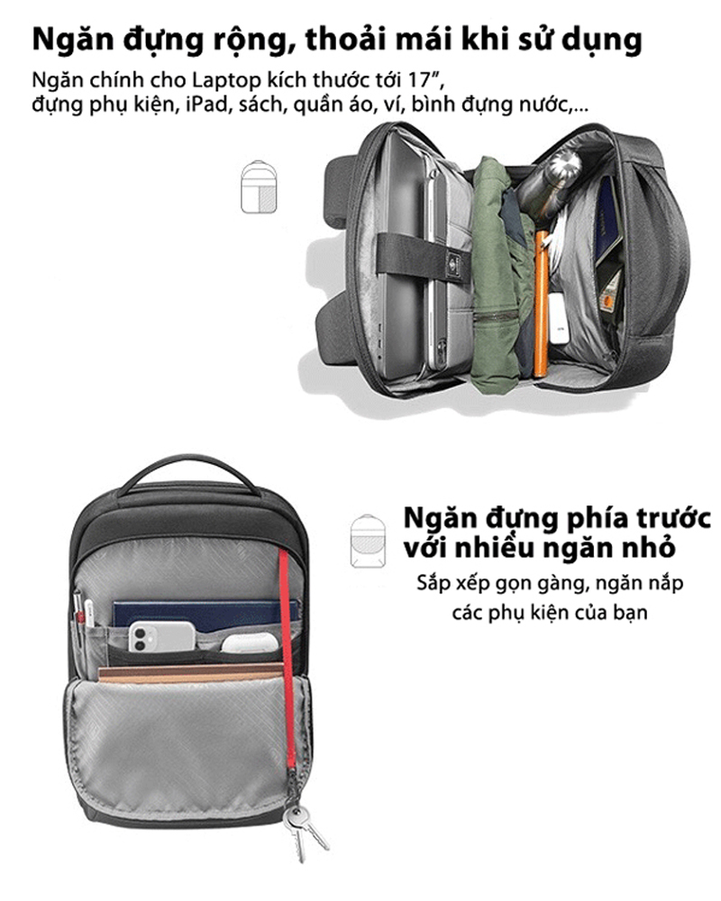 Ngăn phụ mặt trước gồm các ngăn nhỏ đựng những vật nhỏ hơn như sổ tay, pin sạc dự phòng, điện thoại, ví, phone, adapter, được thiết kế thông minh, tiện dụng, không mất nhiều thời gian tìm kiếm, có cả dây treo chìa khóa tránh quên.