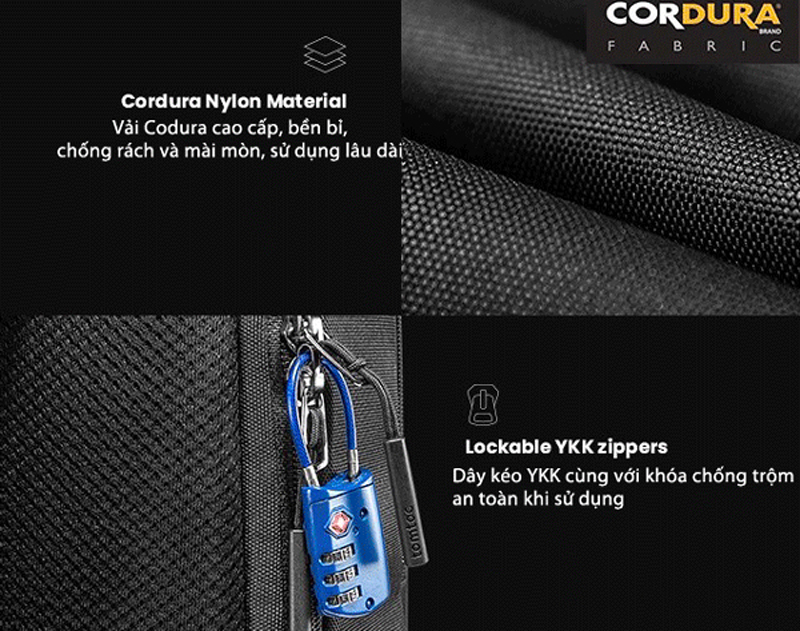 Balo Tomtoc (USA) Premium Lightweight Business được làm từ chất liệu vải cao cấp dày chắc, cứng cáp, chống bám bụi, chống ẩm mốc, hỗ trợ chống thấm giúp làm tăng sự an toàn cho đồ đạc bên trong khi di chuyển dưới mưa. Cùng với các dây kéo YKK tiêu chuẩn quân sự CORDURA, chống nước tối ưu, bền bỉ theo thời gian.