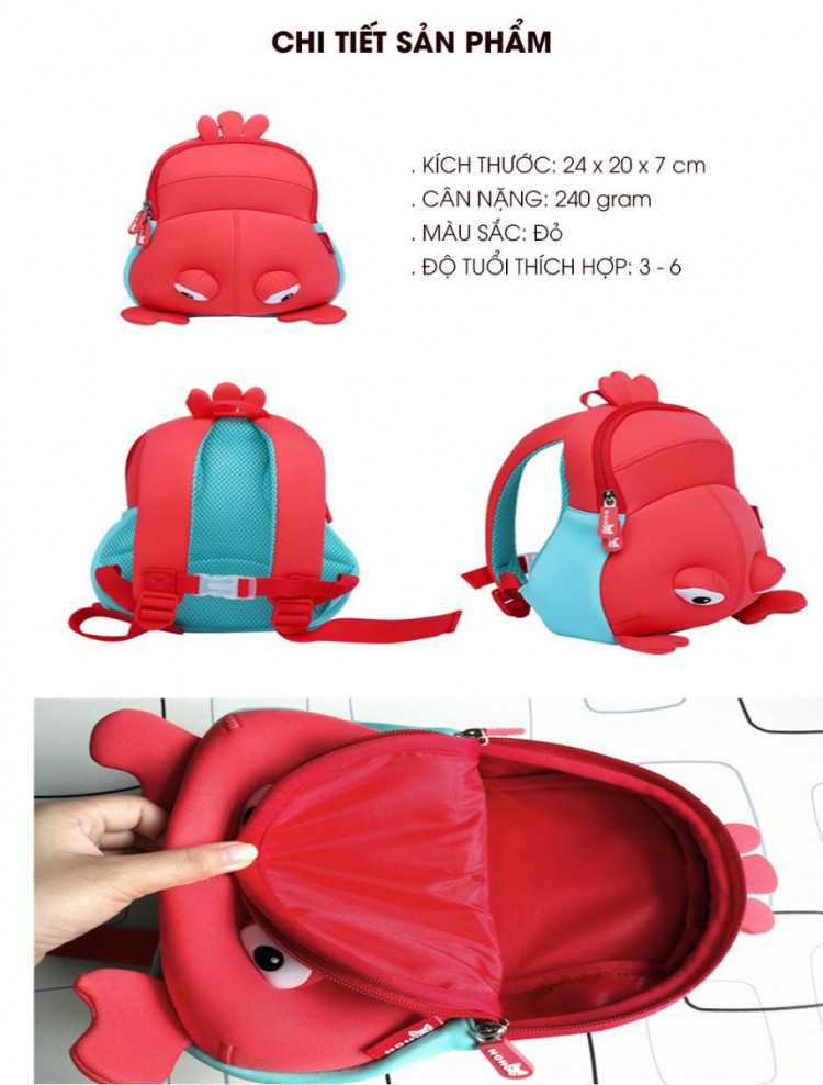 - Balo cho bé Nohoo Tôm Hùm NH062 có thiết kế vô cùng độc đáo với màu đỏ là chủ đạo sẽ gây ấn tượng với bé ngay lần đầu nhìn thấy đấy ạ. Chất liệu cao cấp cực nhẹ và chống thấm nước + Thiết kế khoa học thoáng khí mát lưng + Dây đai giữ lưng thẳng đẹp = Món quà tuyệt vời cho con trẻ