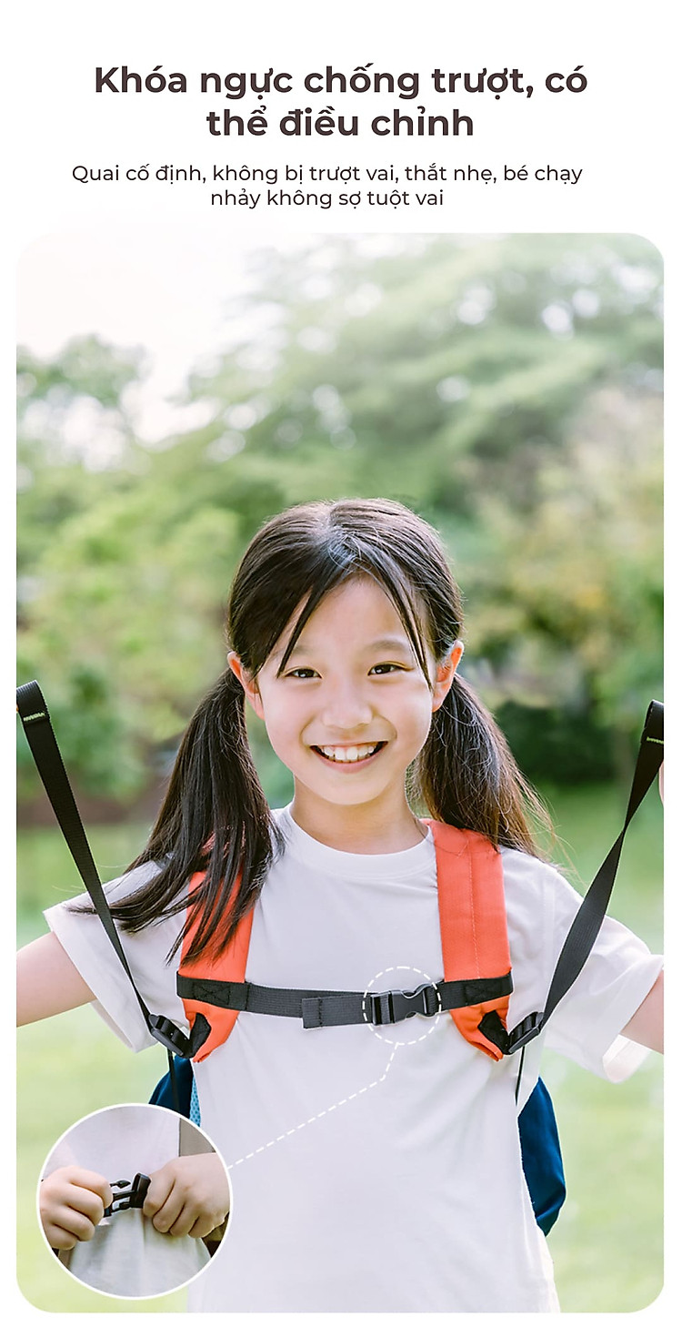 Balo đi học Shukiku trang bị khóa ngực có khả năng điều chỉnh để vừa vặn với cơ thể con, mang đến cảm giác chắc chắc và cố định, con thoải mái vận động mà không lo bị trơn trượt.