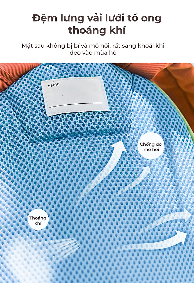 Bề mặt tiếp xúc với lưng trẻ được làm từ lớp vải lưới có nhiều lỗ thoáng khí, khô ráo, thấm hút mồ hôi tốt. Với thiết kế này, con dễ đổ mồ hôi lưng sẽ không còn là vấn đề vào mùa hè nữa rồi.