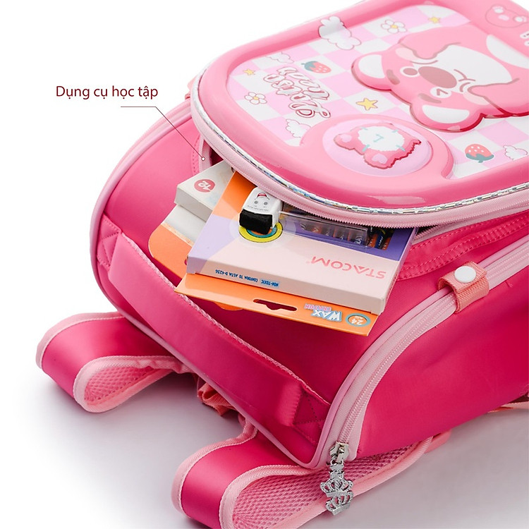 Ngăn chính của balo có thiết kế rộng rãi theo cấu trúc chữ U giúp cố định hình dạng balo, giữ thẳng tập sách bên trong cho bé và khung balo không bị biến dạng khi bé làm rơi cặp hoặc có lực mạnh tác động vào balo. Bên trong ngăn chính kèm theo các ngăn phụ giúp bé có thể phân ra sách vở, thuận tiện hơn trong quá trình học tập. Ngoài ra, balo còn được thiết kế có dây gàng sách vở giúp giữ thẳng, gọn gàng và không bị xô lệch khi di chuyển. Hai bên balo được thiết kế thêm 2 ngăn nhỏ, bé có thể chứa được chai nước, sữa hoặc các vật dụng khác.