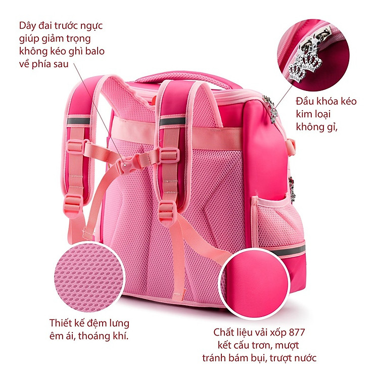 Phía sau balo được thiết kế với những rãnh thoáng khí giữ cho lưng bé luôn thoáng mát, chống va đập mạnh , giúp chống gù lưng, bảo vệ cột sống bé tốt hơn khi mang nặng. Quai đeo balo được may dày, có đệm mút nhẹ, có thể điều chỉnh theo vóc dáng giúp giảm trọng lực lên vai của bé và được thiết kế thêm dây đai ngực giữ balo ôm chặt vào người bé khi bé chơi đùa, chạy nhảy. Ngoài ra, quai đeo có thêm 1 đoạn dây phản quang giữ an toàn khi bé đi học khi trời tối. Bên dưới balo có chân đế có thể dễ dàng giữ đứng balo và chống bám bẩn khi các bé để balo tiếp xúc với mặt đất. Balo có thể xếp gọn khi không sử dụng bằng cách gỡ các nút gày 2 bên. Thuận tiện hơn trong các trường hợp cần thiết. Dây kéo hợp kim chống rỉ sét, với thiết kế lá kéo hình vương miện đặc sắc góp phần làm nổi bật lên chiếc balo chống gù 970