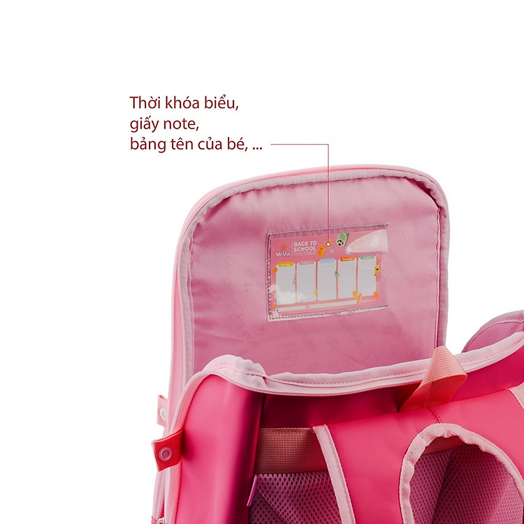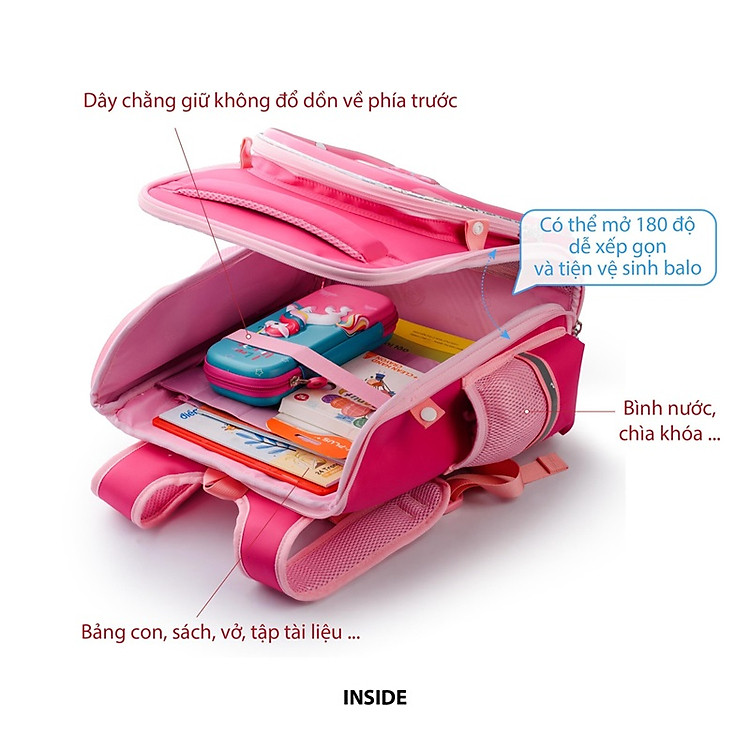 Ngăn chính của balo có thiết kế rộng rãi theo cấu trúc chữ U giúp cố định hình dạng balo, giữ thẳng tập sách bên trong cho bé và khung balo không bị biến dạng khi bé làm rơi cặp hoặc có lực mạnh tác động vào balo. Bên trong ngăn chính kèm theo các ngăn phụ giúp bé có thể phân ra sách vở, thuận tiện hơn trong quá trình học tập. Ngoài ra, balo còn được thiết kế có dây gàng sách vở giúp giữ thẳng, gọn gàng và không bị xô lệch khi di chuyển. Hai bên balo được thiết kế thêm 2 ngăn nhỏ, bé có thể chứa được chai nước, sữa hoặc các vật dụng khác.