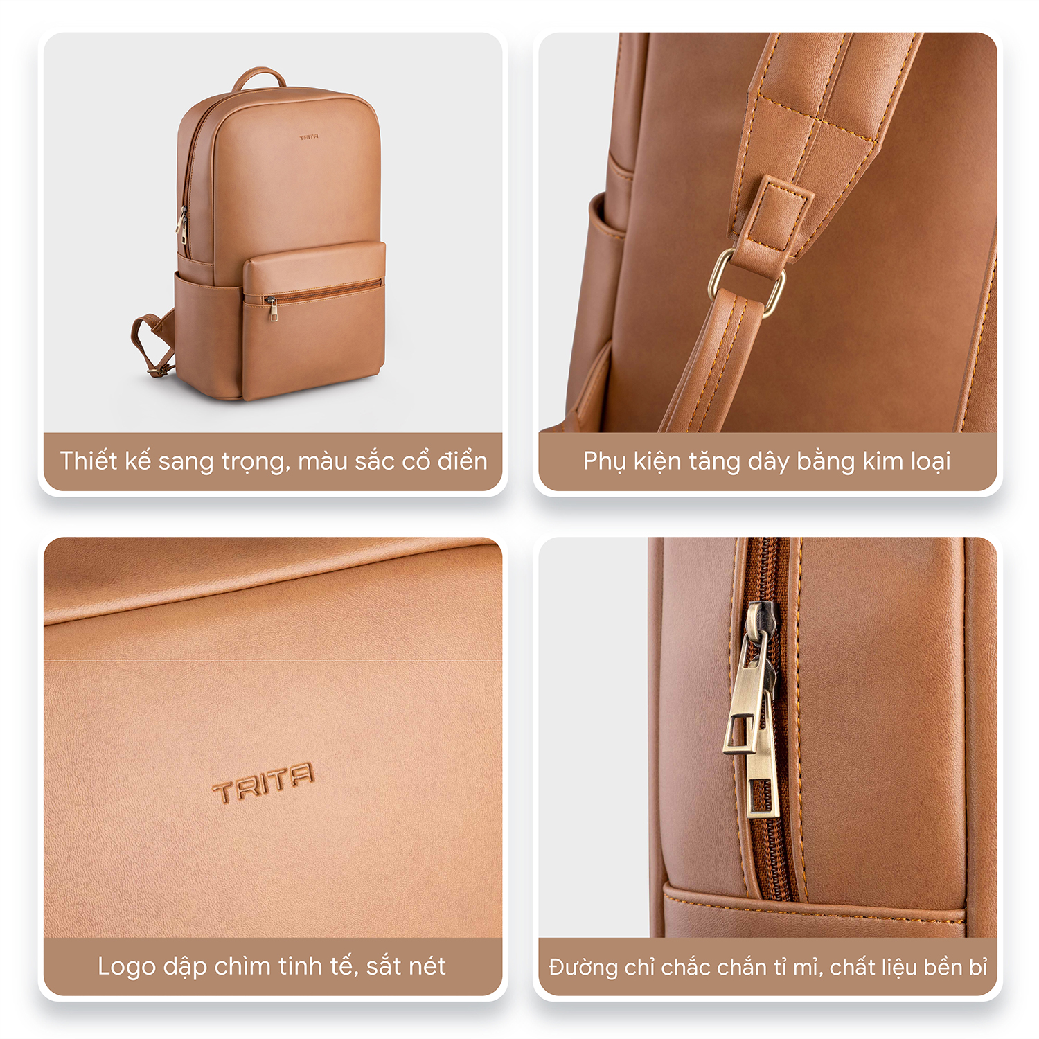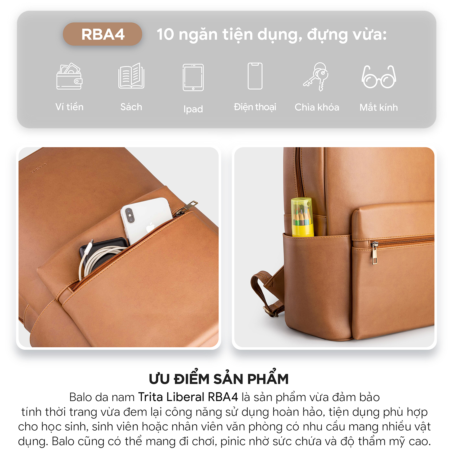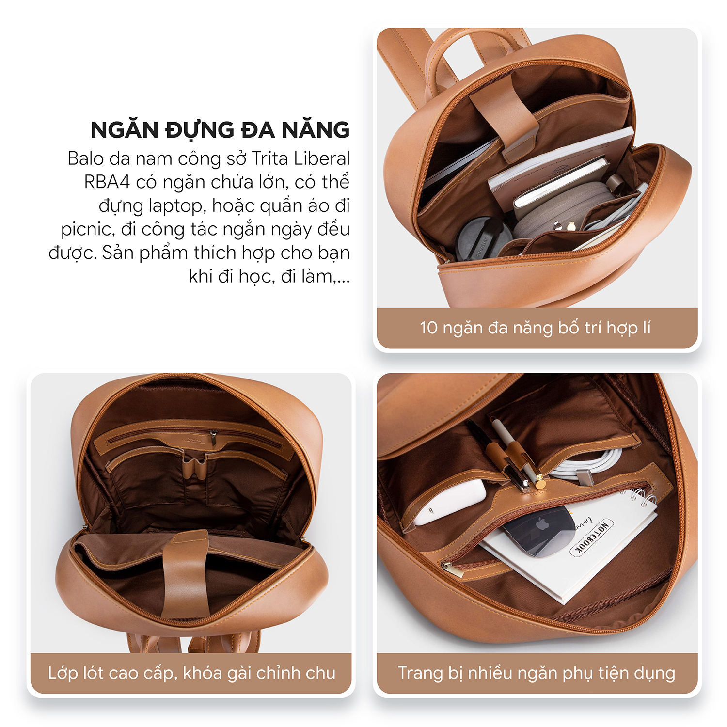 Balo da nam công sở Trita Liberal RBA4 được làm từ chất liệu da tổng hợp cao cấp, không bong tróc, không thấm nước, đường chỉ may chắc chắn bền bỉ khi sử dụng. Ngăn chứa bên trong balo lớn, có thể bỏ laptop, hoặc bỏ quần áo đi picnic, đi công tác ngắn ngày đều được. Sản phẩm thích hợp cho bạn khi đi học, đi làm,