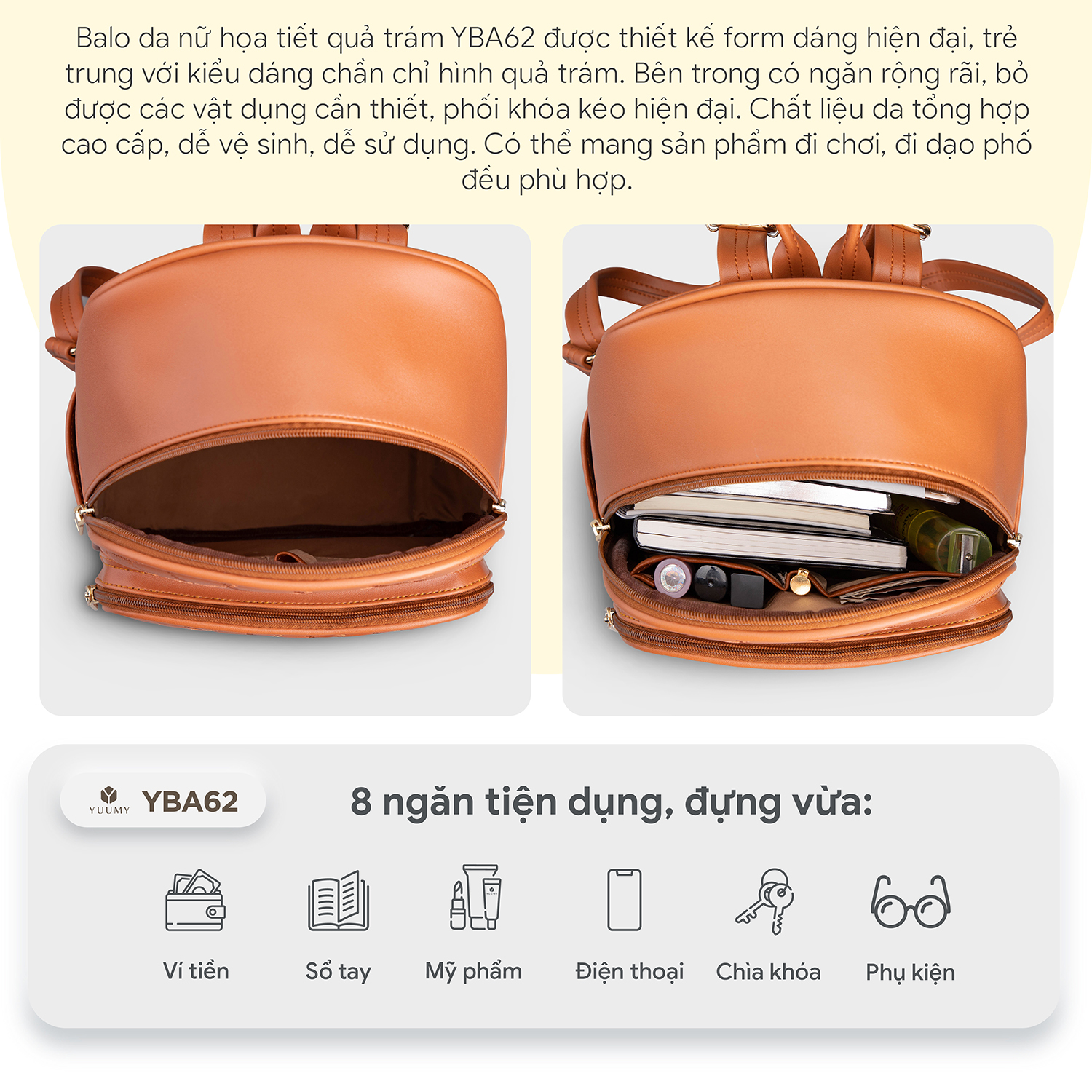 Balo da nữ họa tiết quả trám Yuumy YBA62 được thiết kế form dáng hiện đại, trẻ trung với kiểu dáng chần chỉ hình quả trám. Bên trong có ngăn rộng rãi, bỏ được các vật dụng cần thiết, phối khóa kéo hiện đại. Chất liệu da tổng hợp cao cấp, dễ vệ sinh, dễ sử dụng. Có thể mang sản phẩm đi chơi, đi dạo phố đều phù hợp.